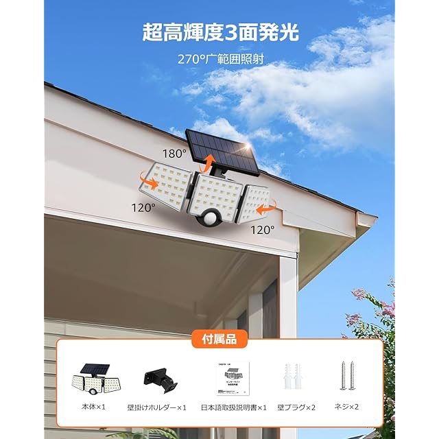 商品名:Lepro ソーラーライト ガーデンライト 防犯ライト 光・人感センサー 夜間自動点灯 昼間自動充電 人が離れたら自動消灯 昼光色 1,000ルーメン 超高輝度LED搭載 3面発光 角度調整 防水防雨 壁掛け式 省エネ 120°感知角度 270°発光範囲 屋外/軒/庭/玄関/駐車場/車道/ガレージ 防犯対策 停電・災害時に適用 1個単品 ブラック