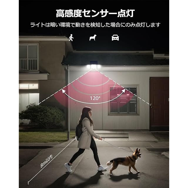 【人感・光センサー搭載&自動点灯・消灯】光センサーが搭載されており、夜間になると自動的に電源がONになり、朝になると自動的にOFFになります。また、人感センサーも搭載されており、人や車の動きを感知するとライトが20秒間点灯します。玄関、駐車場、庭、階段、通路や家の周りの防犯など様々なシーンで大活躍します。