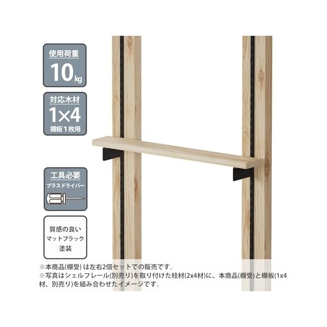 平安伸銅工業 LABRICO 棚柱 棚受け 棚受け金具 2枚入 1x4棚受 (棚板1枚用) シェルフレール対応 最大使用荷重10kg アイアン 100 取付ねじ付き マットブラック IXK-528 | emishop315