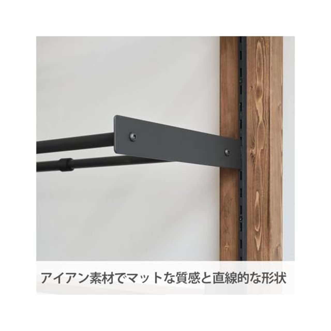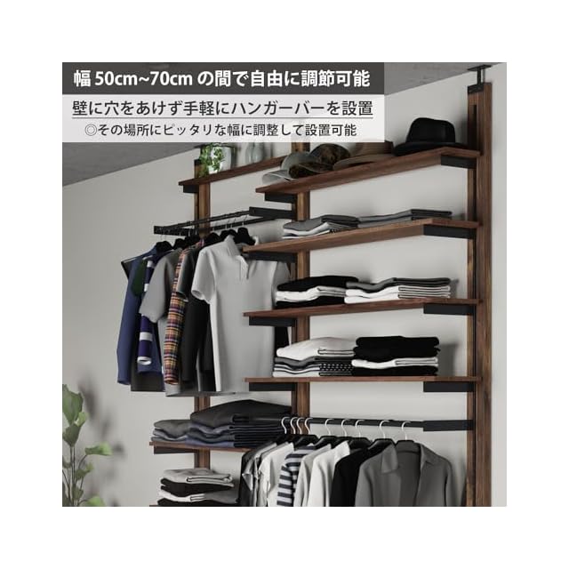 壁一面での使用はもちろん、小さい空間にも対応可能。ラックとハンガーバーは伸縮自在。木材の長さも好みに調節すれば、デッドスペースにもぴったりの家具が完成します。