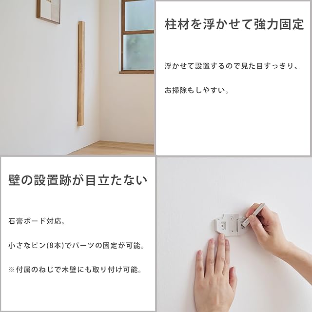 壁面に小さなピンで、柱材を浮かせて設置できるブラケット。1×4 材 / 2×4 材に対応で、壁を大きく傷付けず取付簡単。柱材1本固定用。