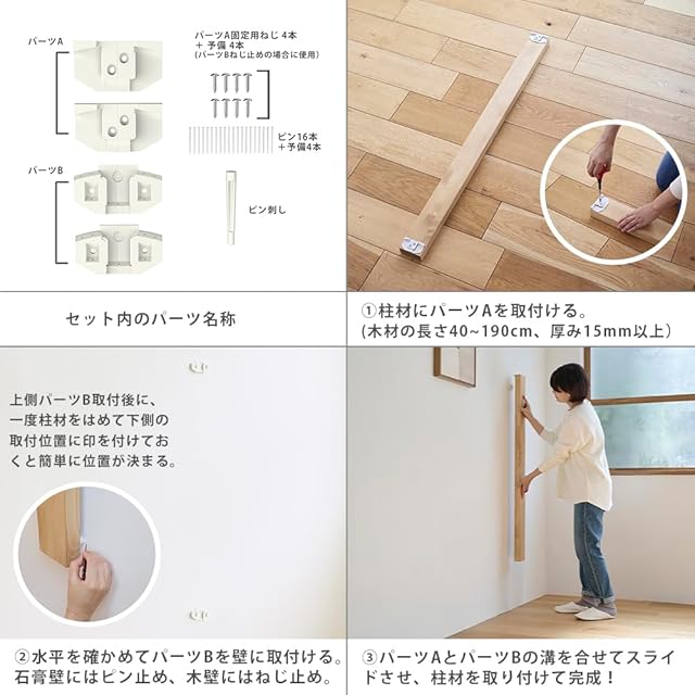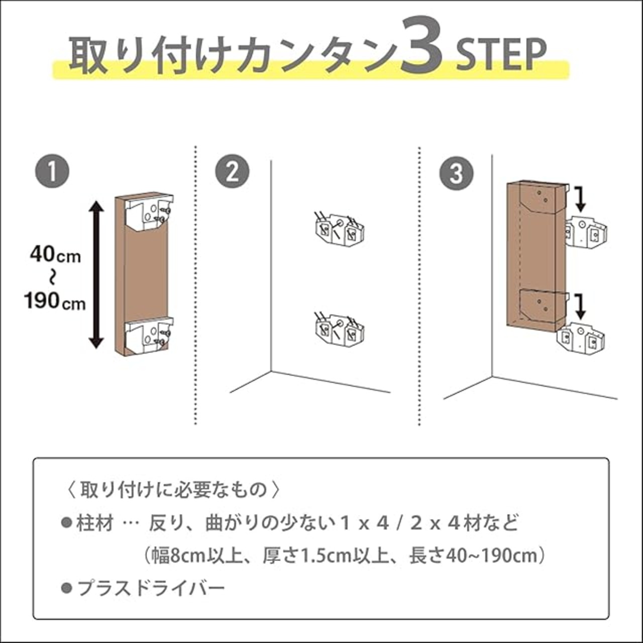 【使用荷重】柱1本あたり 最大40kg 【対応木材】〈厚み〉15mm以上の木材(1x4材や2x4材に対応) 〈板の長さ〉約40cm~190cmまで 【棚前出し】壁から40cm