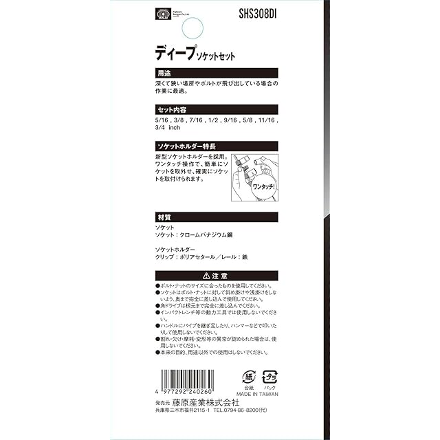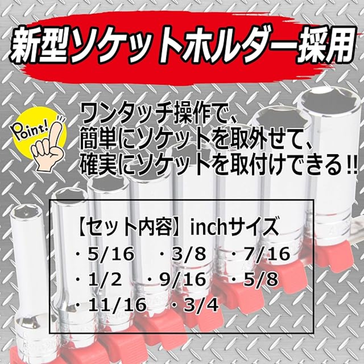 商品内容:差込角9.5mm、セット:5/16・3/8・7/16・1/2・9/16・5/8・11/16・3/4インチ