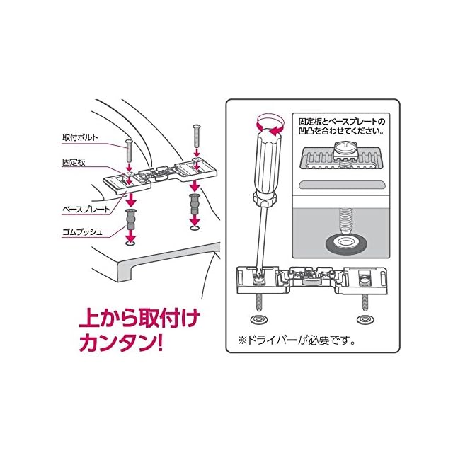 ベースプレートを取り付け、本体をスライドして取り付けるだけ! 狭い場所でも簡単に取り付けが可能です。