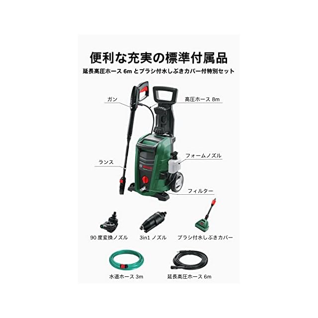 商品名:ボッシュ(BOSCH)高圧洗浄機特別セット (6m延長高圧ホース・ブラシ付き水しぶきカバー特別付属)1500W 最大許容圧力12MPa パワフル洗浄 コンパクト収納 [8m高圧・3m水道ホース・車輪付き] UA125J3