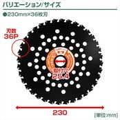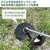 【特徴】石に強いチップソーです。鉄鋼用チップソーの埋め込み刃型に特殊研磨で切れ味もバツグン!本体中心にまっすぐに深く埋め込まれたチップは、ロー付け面積が広いためチップが飛びにくい設計で、驚異的なチップ耐久性を実現しました。タイルや石を切るチップソーの刃形を参考に屈強刃チップを実現しました。殆どのメーカーのエンジン刈払機にも取付られます。