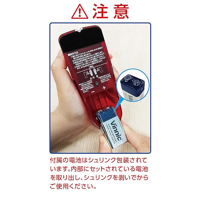 付属の電池は動作確認用のモニター電池ですので、ご使用の際は新しい電池をご用意ください(電源 9Vアルカリ乾電池×1個 ※ビニールの被覆を剥いでからご使用ください)