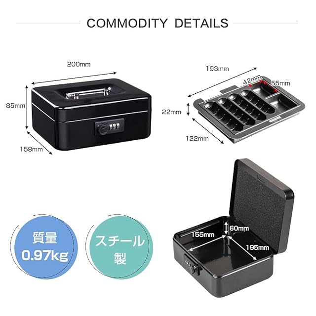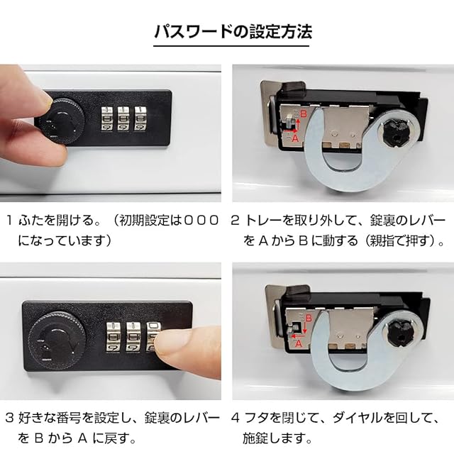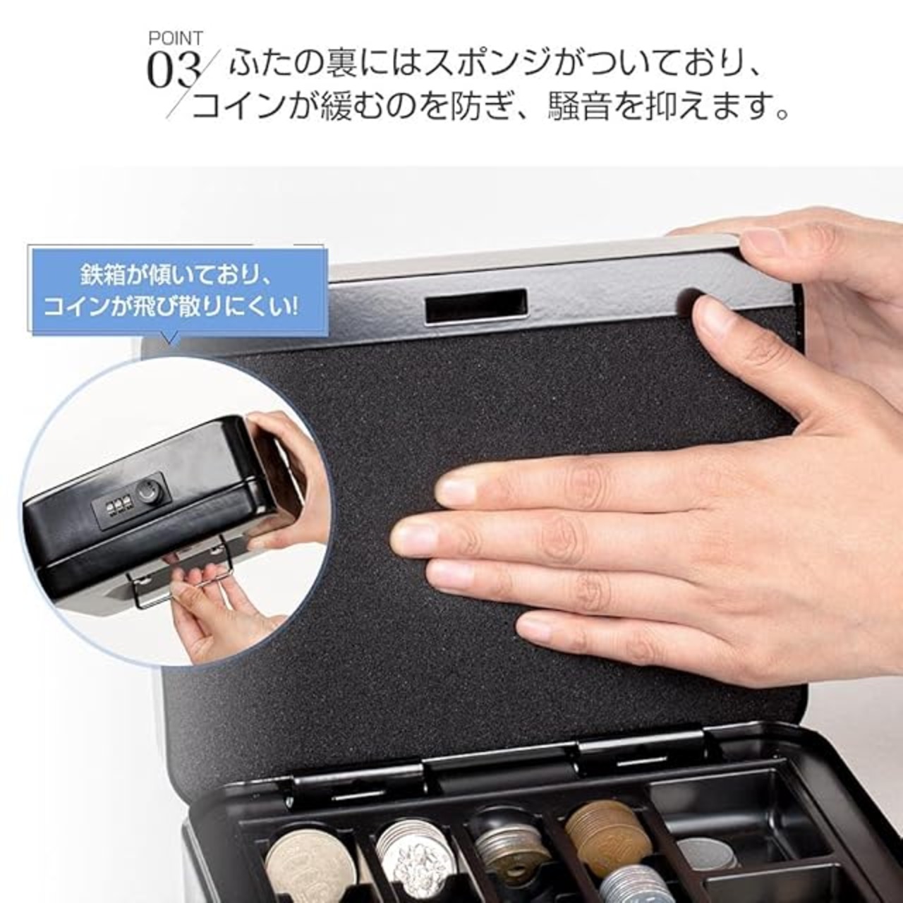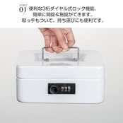 スチール収納ボックス。3桁ダイヤル式ロック。トレー付き。<br /> 上部のトレイにはコインを収納でき、下段はメモなどの収納に最適です。<br /> 便利な3桁ダイヤル式ロック機能、簡単に解錠&施錠ができます。<br /> 取っ手もついて、持ち運びにも便利です。<br /> トレーの色はどれもブラックで、取り外しが可能です。<br />「仕様・サイズ」<br /> ・サイズ:【箱】約20×15.8×8.5cm、【トレー】約19.3×12.2×2.2cm<br /> ・材質:スチール製<br /> ・カラー:ホワイト<br /> <br />