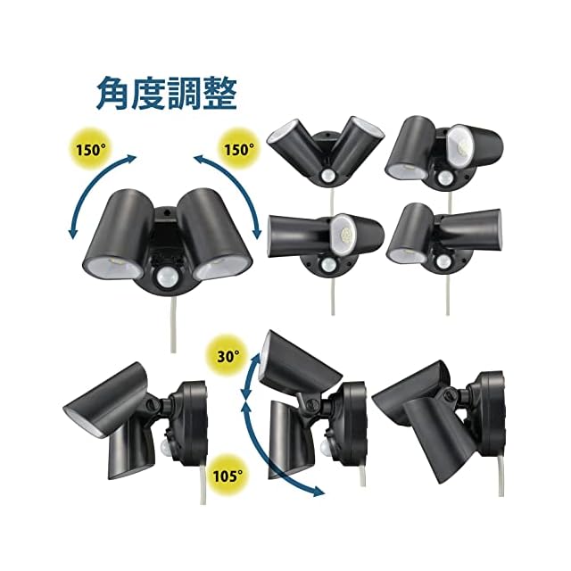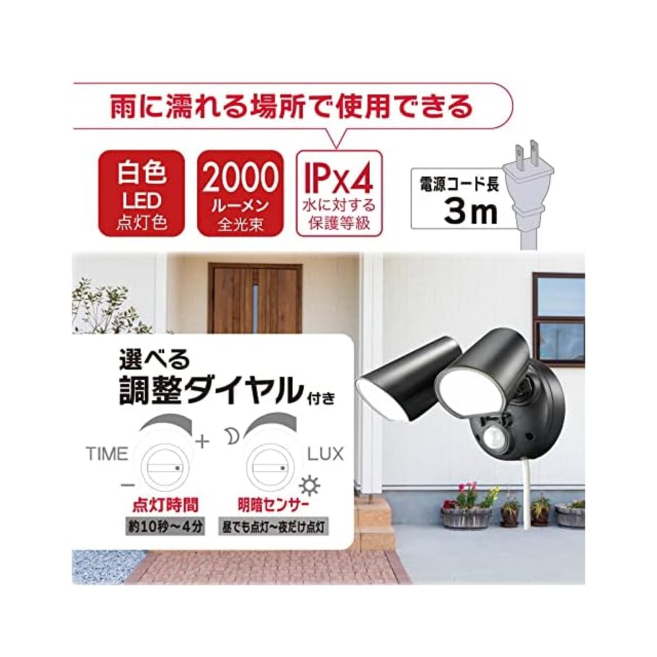 【 特 長 】● 明るさ強力2000ルーメン● 雨に濡れる場所で使用できます● 点灯開始照度・点灯時間の調整ダイヤル付き● 家庭用100V電源タイプ● 赤外線センサーで人を検知しライトが点灯● 光源は白色LEDを24個使用● ライトの首が動き、お好みの位置を照らすことができます