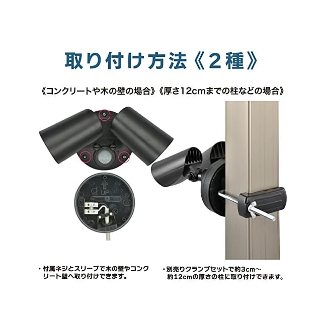 弊社別売クランプセット(品番:07-8285/型番:OSE-SCS1D)で 柱に取付可能【 仕 様 】■ 検知方式:赤外線受動式■ 使用電源:AC100V 50/60Hz■ 消費電力:約20W(待機時 約1W)■ 光源:白色LED(全光束 約2000ルーメン)■ 点灯保持時間:約10秒~約4分■ 外来固形物に対する保護・水に対する保護:IPX4(あらゆる方向からの水の飛まつに対する保護等級)※JIS C0920:2003による