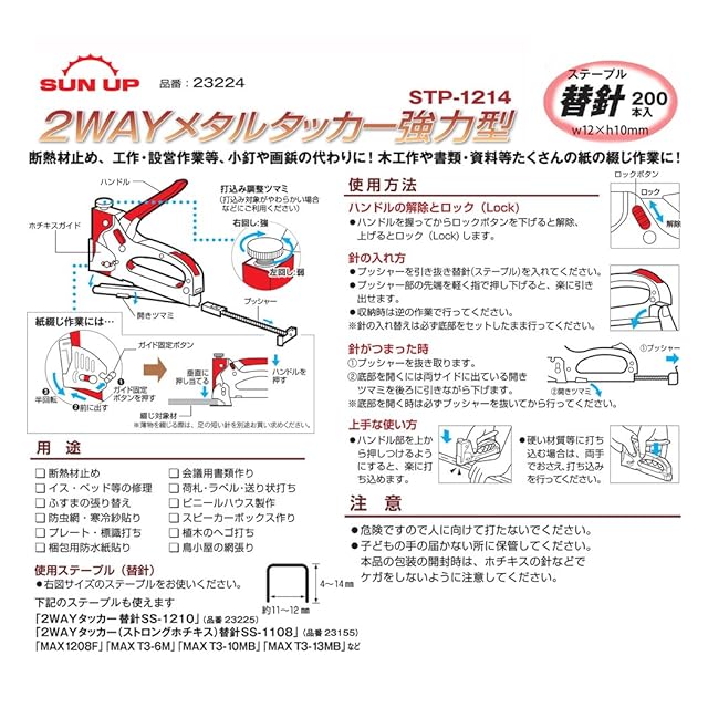 SUN UP 2ウェイメタルタッカー強力型 & 替針(ステープル)200本付き STP-1214 断熱材止め 工作や設営作業等の小釘や画鋲の代わりに 木工策や書類などの紙の綴じ作業に | emishop315