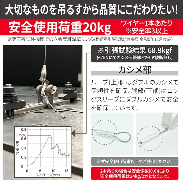 【大切なものを吊るすから品質はこだわりたい】ワイヤー1本あたりの最大吊り下げ重量は20kg※(耐荷重試験/東京都 令和5年12月実施 引張試験結果68.9kgf)カシメ部(ループ上側)はダブルで信頼性を確保。端部(下)側はロングスリーブにダブルカシメで安全性を確保しています。