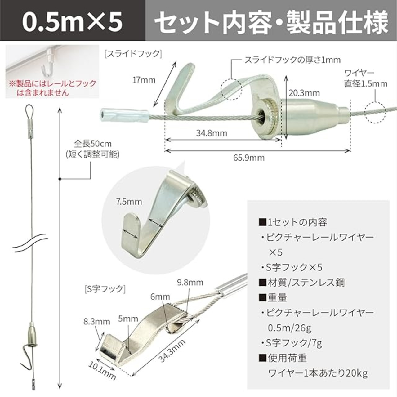 【商品詳細】ワイヤーフック 2本~20本セット。<ワイヤーの太さ>直径1.5mm<スライドフック>全長65.9mm 高さ20.3mm<S字フック>全長34.3mm 横幅10.1mm 重量7g 材質:ステンレス鋼 重量:0.5m/26g1.0m/31g1.5m/35g