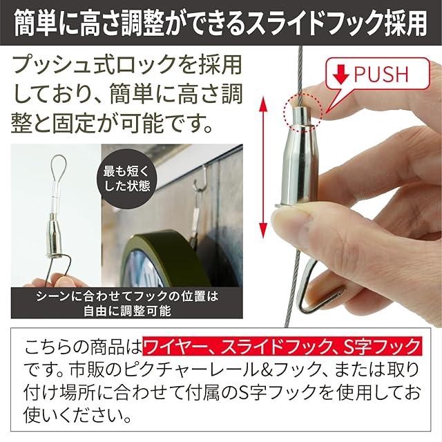 【大切な絵画をしっかり固定】<br>丈夫なステンレスワイヤーで安心・安全に額やポスターなどを固定することができます。シンプル・スタイリッシュなデザインで使用場所を選びません。※当商品にピクチャーレール&ピクチャーレールに装着する専用フックは付属しておりません。別途市販品をお買い求めください。<br><br> 【あらゆる場所で使えるすっきりデザイン】<br>小さな絵は1点吊りで、大きな絵は2点吊りでご使用ください。ワイヤーには壁面フックやレールフックなどにひっかけてください。付属のS字固定具は長押などにひっかけ、ワイヤーをひっかけて頂くことが可能です。<br> ※市販のピクチャーレールなどにS字フックを直接ひっかけるのはやめてください。脱落の恐れがあります。<br><br> 【簡単に高さ調節ができるスライドフック採用】<br>プッシュ式ロックを採用しており、簡単に高さ調節が可能です。 取り付け部分の筒を押し上げることで簡単に移動できます。片手で調整できるため女性や初心者の方でもストレスなく快適にご使用いただけます。<br><br> 【大切なものを吊るすから品質はこだわりたい】<br>ワイヤー1本あたりの最大吊り下げ重量は20kg※(耐荷重試験/東京都 令和5年12月実施 引張試験結果68.9kgf)カシメ部(ループ上側)はダブルで信頼性を確保。端部(下)側はロングスリーブにダブルカシメで安全性を確保しています。<br><br> 【商品詳細】<br>ワイヤーフック 2本~20本セット。<br><ワイヤーの太さ>直径1.5mm<br><スライドフック>全長65.9mm 高さ20.3mm<br><S字フック>全長34.3mm 横幅10.1mm 重量7g<br> 材質:ステンレス鋼 重量:0.5m/26g1.0m/31g1.5m/35g