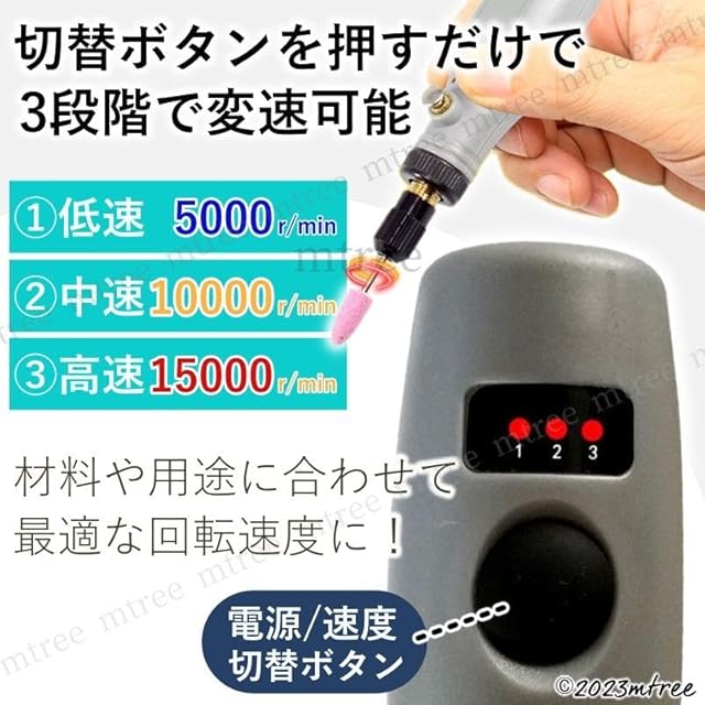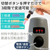 【3段変速可能】ミニルーター本体付属のボタンを押すだけで回転数を5000、10000、15000rpmmin-1の3段階に調整が可能で、作業内容や材料によって最適なトルクを設定できます。