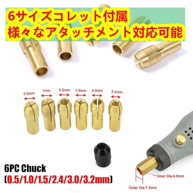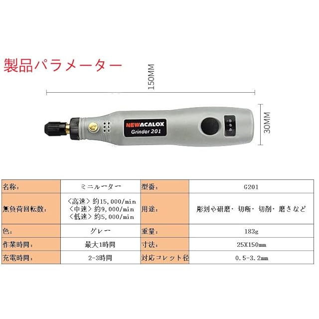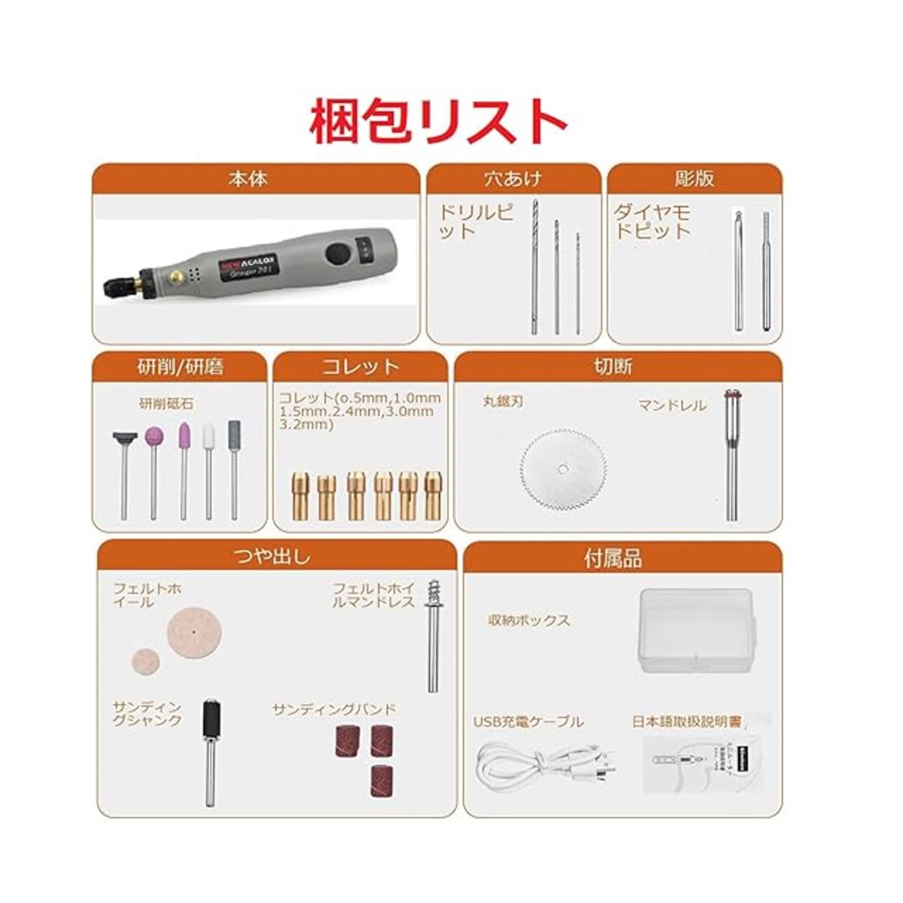 型番:G201 用途:彫刻 フライス 研削 研磨 除去 穴あけ など サイズ:φ25*150mm コレット:0.5-3.2mm 回転数:5000-15000/min 連続稼働時間:最大1時間 「内容」 電気ドリル(本体) USBコード マンドレル×1 ゴムホイール×1 タッピングロッド×1 円形鋸×1 ダイヤモンド研削針×2 ウール研磨ホイール×2 サンドペーパーサークル×3 ツイストドリルビット×3 ホイール研削ヘッド×5 電気ドリルビットコレット×6 (0.5 1.0 2.4) 収納ボックス×1
