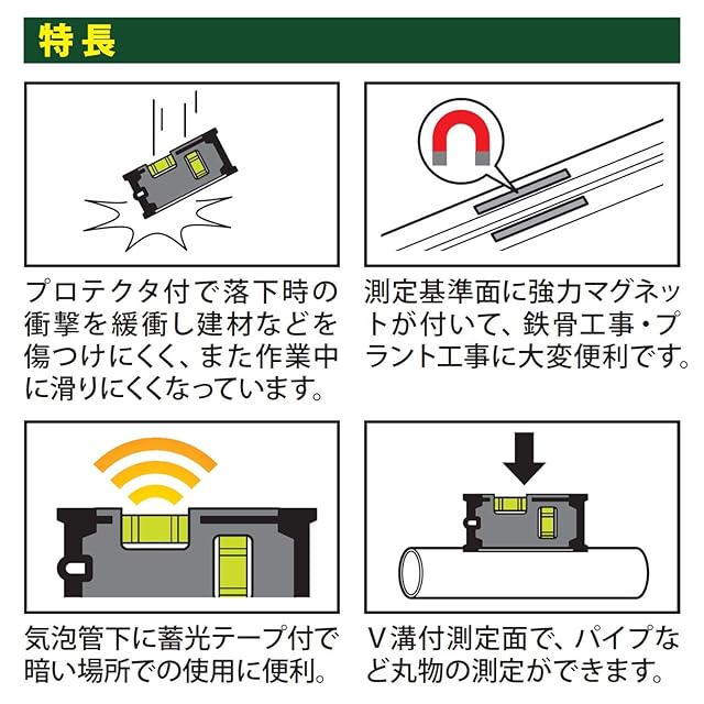 用途:建築、土木・配管・電気・プラント・設備据付などの工事、日曜大工などの作業で水平・垂直の測定