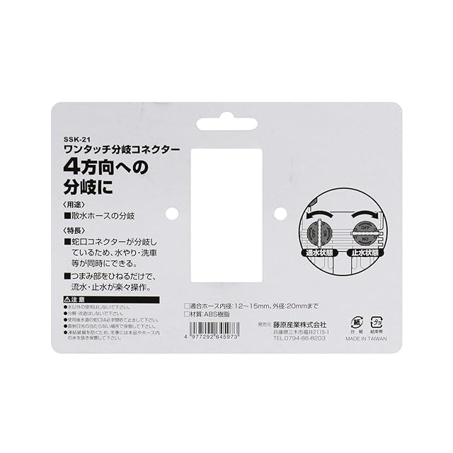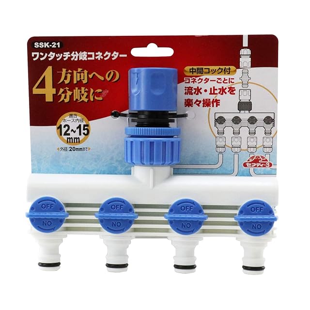商品名:セフティー3(Safety-3) ワンタッチ 蛇口 ホース分岐コネクター 4方向 10~15mm内径対応 中間コック付 SSK-21