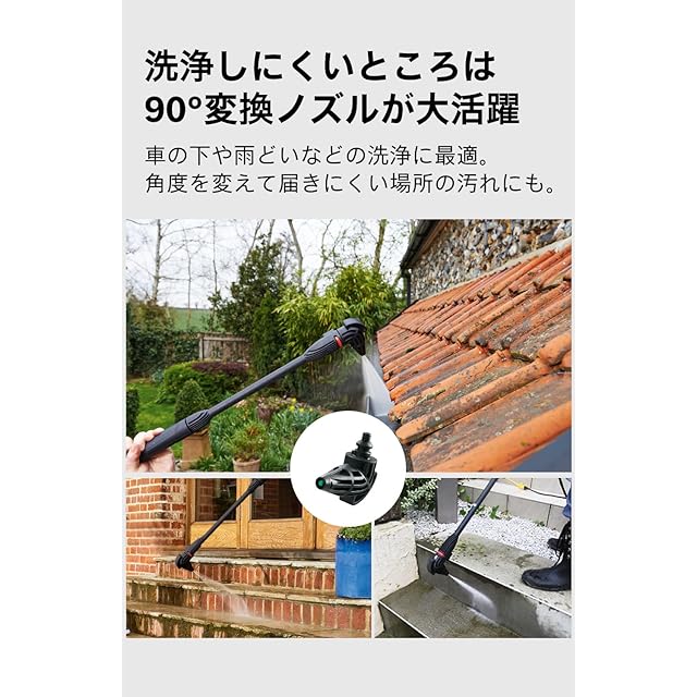 車の下や雨どい、2階の窓などの洗浄に活躍する「90度変換ノズル」