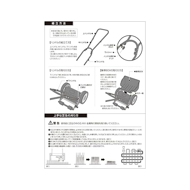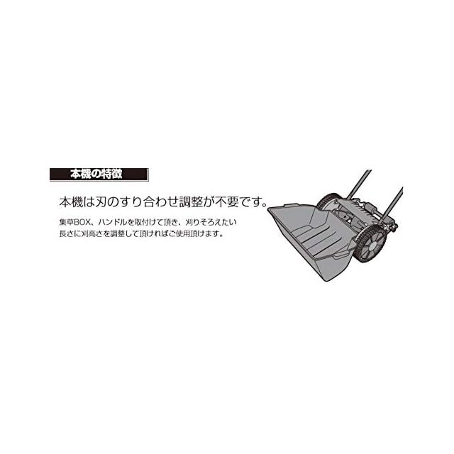 ◉受け刃とリール式回転刃のすり合わせにより芝生を取り、前キャッチャーで収草 押すとホイールとリール刃が回転して芝のカットを始めます。