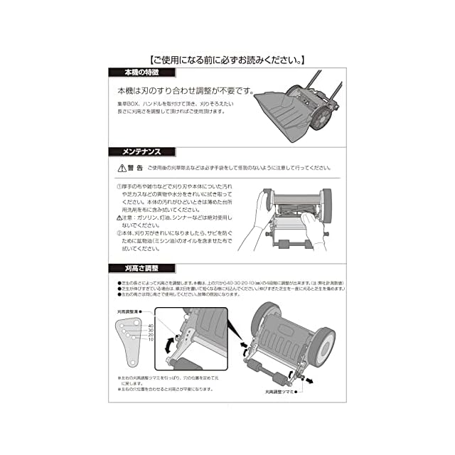 ◉刈高さ:4段階調整(10・20・30・40mm) 刃調整不要の自動調整刃タイプ