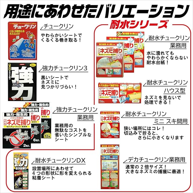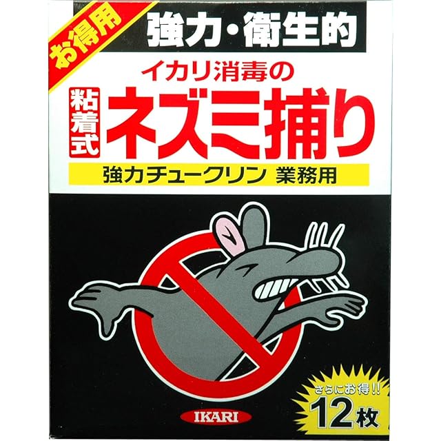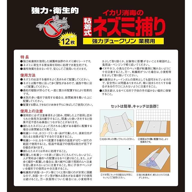 商品名:イカリ消毒 強力チュークリン業務用 12枚入 粘着式ネズミ捕り 強力粘着剤でネズミを逃がさない ノミ、ダニも取れるので衛生的 ネズミが巻き付きやすい観音開きタイプ