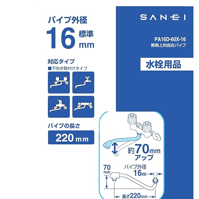 商品名:SANEI(サンエイ) 断熱上向自在パイプ 断熱キャップ付 高さ約70mmアップ 外径16mm 長さ220mm PA16D-60X-16