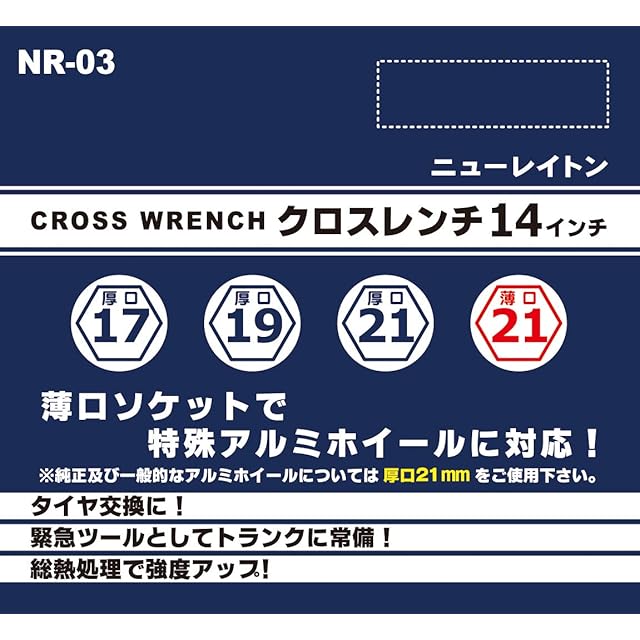 商品名:NEWRAYTON(ニューレイトン) クロスレンチ 14インチ 17・19・21・21(薄口)mm カバー付き タイヤ交換 パンク修理 緊急ツールとしてトランクに常備 総熱処理で強度アップ 薄口21mmソケットで特殊アルミホイールに対応 NR-003