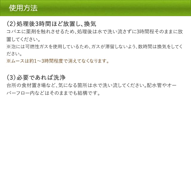 コバエ・チョウバエ専用駆除剤です。400ml入りでたっぷり使えます。チョウバエ類・コバエ類が発生していると思われるところに泡を注入し、害虫を発生源から退治します。ムースが細かい隙間まで浸透し、しっかり駆除。逃げ道を塞ぎ発生源から駆除します。有効成分が幼虫に作用し、しっかりコバエ・チョウバエ駆除。 【消防法】非危険物 【毒物及び劇物取締法】非該当 【国連番号】1950 【クラス】2.1 【品名】エアゾール類 【容器等級】3 ●安全性について ◆コバエ用ムースには、「ピレスロイド系殺虫剤」と「IGR剤(昆虫成長制御剤)」を使用しています。 ◆ピレスロイド系殺虫剤は、哺乳動物に対する毒性が低く、安全性の高い成分となります。 ◆IGR剤(昆虫成長制御剤)は、通常の化学殺虫剤(中毒死させる殺虫剤)とは異なり、コバエの幼虫が脱皮するのを阻害して、死亡させる「幼虫駆除剤」です。哺乳動物に対して安全性の高い成分となります。 ◆排水口などに奥で発生しやすいチョウバエ・コバエ類の成虫、幼虫駆除におすすめです。 ●使用上の注意 ◆定められた使用方法を厳守すること。 ◆食品ではありません、絶対に食べないでください。 ◆子供の手の届かないところに保管して下さい。 ◆その他、使用上の注意をよく読んでから使用すること。