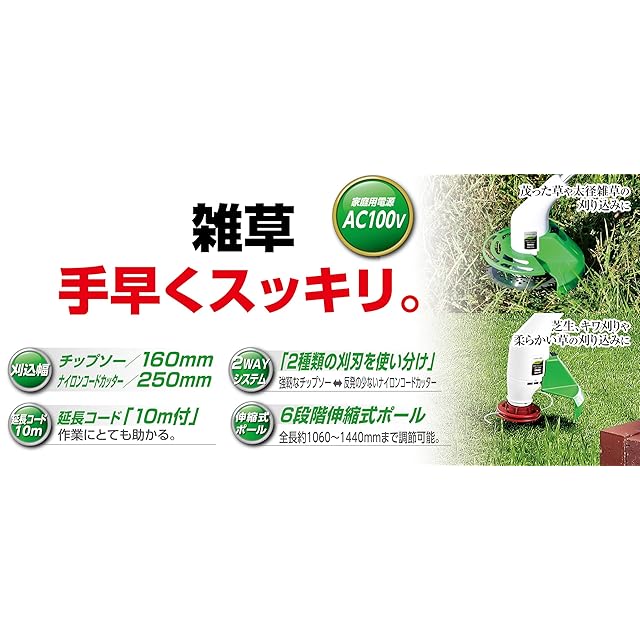 仕様/電圧:AC100V、周波数:50/60Hz、電流:2.6A、定格消費電力:250W、回転数:約6500min-1(チップソー)、約5500min-1(ナイロンコードカッター)、刈込幅:約160mm(チップソー)、約250mm(ナイロンコードカッター)、電源コード長:約0.4m、延長コード:約10m、定格時間:30分