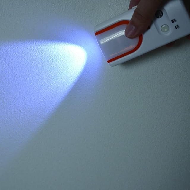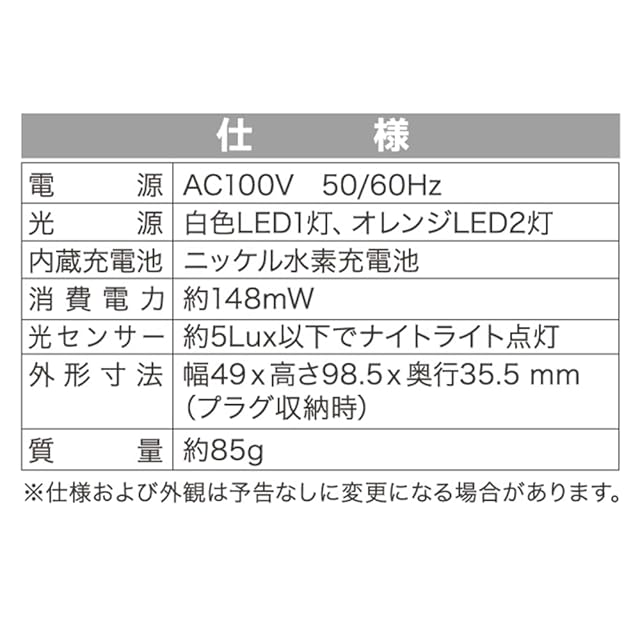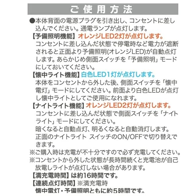 光源:オレンジLED2灯(予備照明・ナイトライト)、白色LED1灯(懐中電灯)