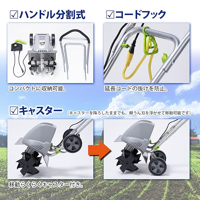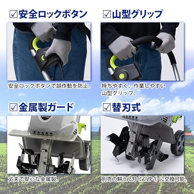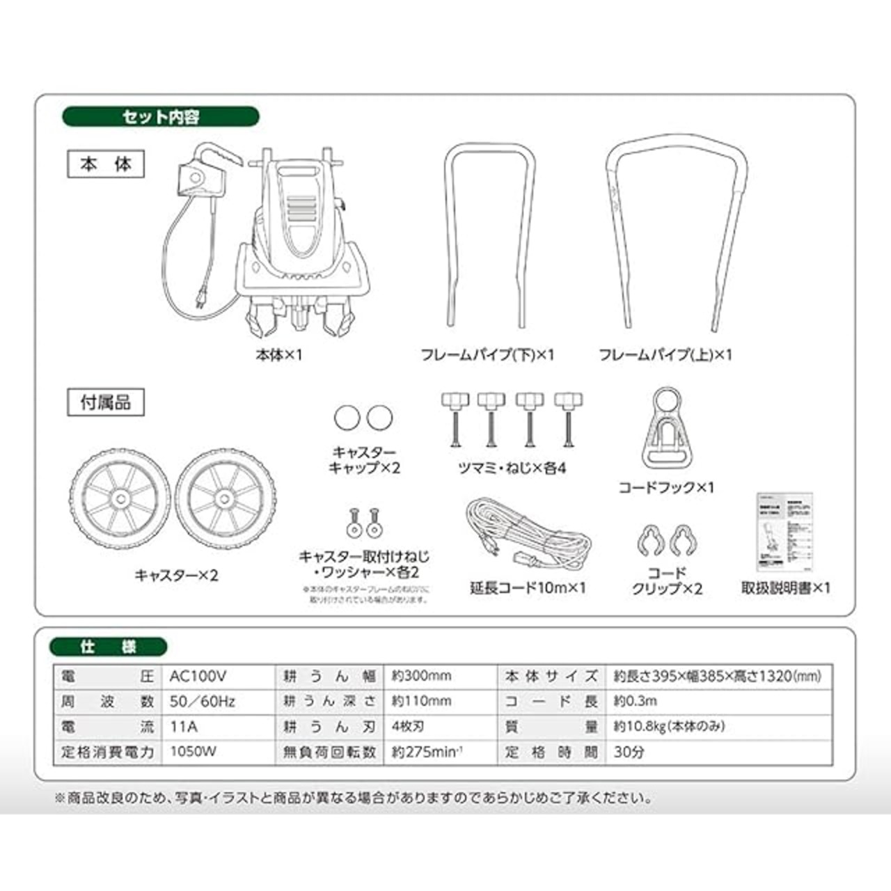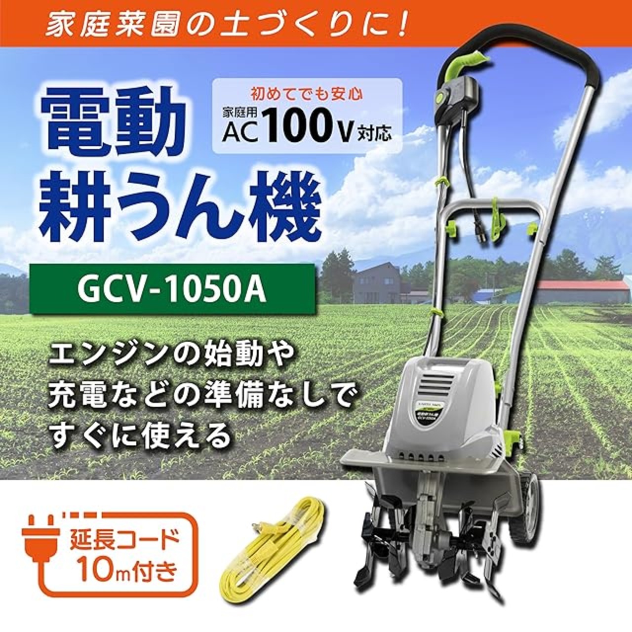 商品名:髙儀 EARTH MAN 電動耕うん機 1050Wハイパワー GCV-1050A 【10m延長コード付】【エンジン始動の手間いらず、すぐに使えて静か】家庭菜園 耕運機 家庭用 電動耕運機 耕うん機