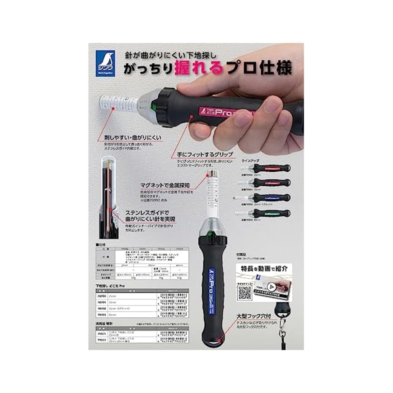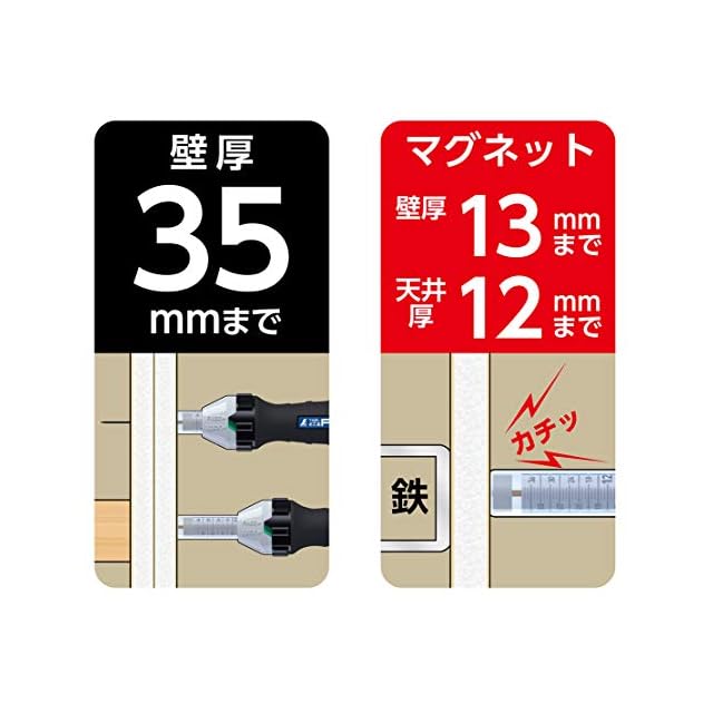 探知可能壁厚(針):35mm 探知可能壁厚(マグネット):壁厚保13mm、天井厚12mm 可動カバー:ロック付 本体サイズ:φ36×214mm 替え針:2本入り 材質:本体針押さえ、ABS樹脂 可動カバー、ポリカーボネート樹脂・ABS樹脂・ステンレス、エラストマーグリップ ABS樹脂、エラストマー樹脂 マグネット部 ネオジム磁石、黄銅