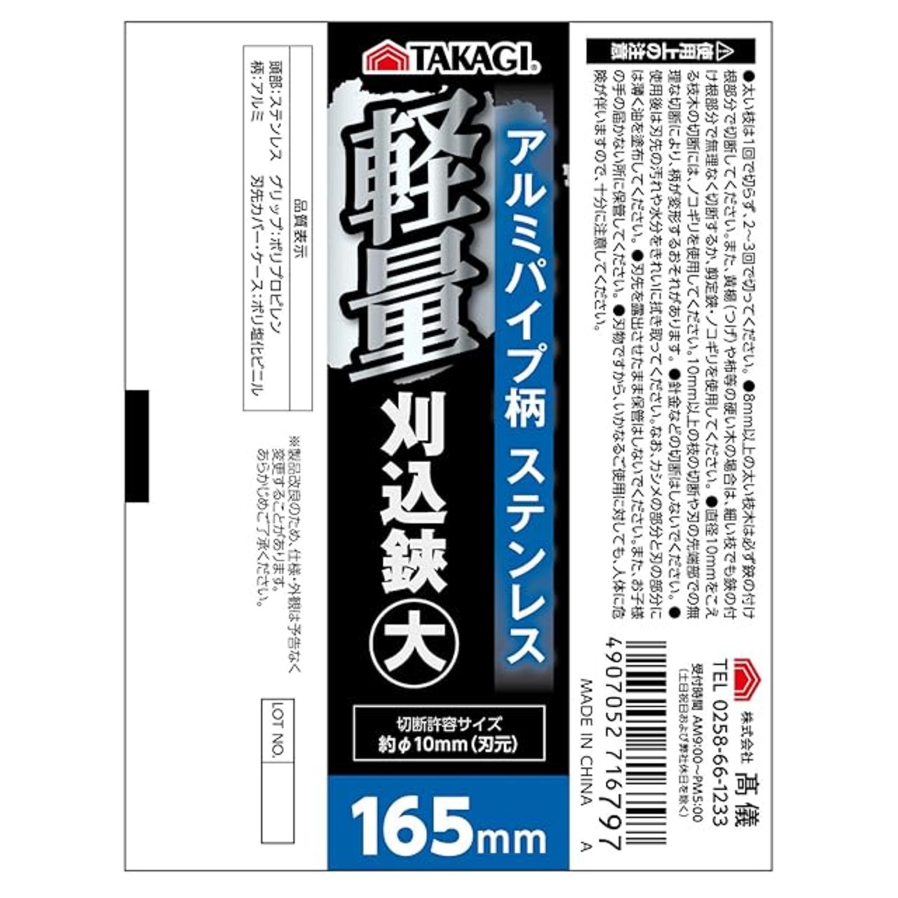 商品名:髙儀(Takagi) 高儀 TAKAGI アルミパイプ柄 ステンレス 軽量刈込鋏 大 165mm