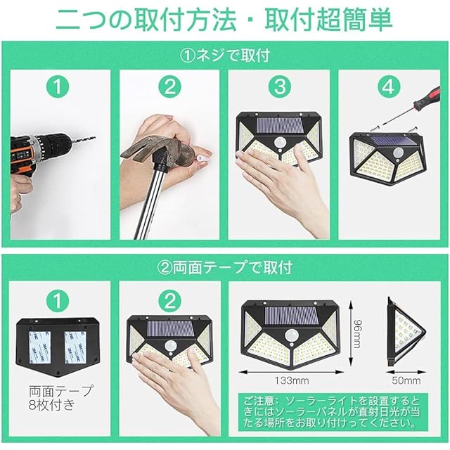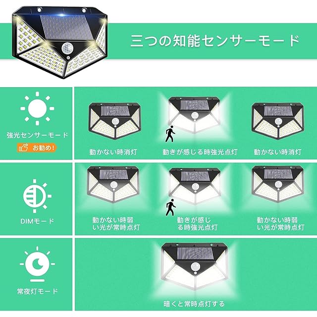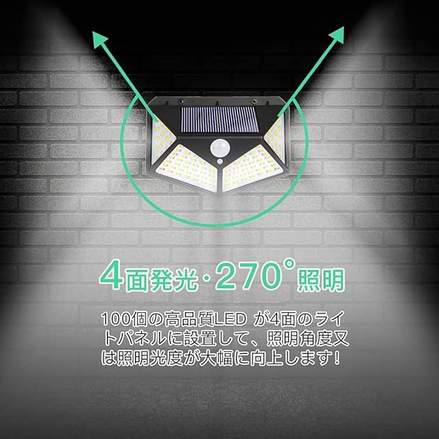 ソーラーライト・2025最新進化版が新登場!100高輝度LEDチップに進級して、4面に同時照射でき、270°の照明角を達します!発光効率が向こうだけではなく、ライトの発熱もう少なくて、低赤外線・低UVで虫も集まりにくくなるソーラーライトです!また、センサー機能向上の為にはセンサー検知角は120°にデザインして、従来の検知角90°のセンサーライトよりほとんどあらゆる角度は不審者を威嚇できます。