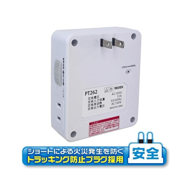 入力電圧:AC100V・50/60Hz (裏側のスイッチで周波数を切り替える)、出力電圧:AC100V・50/60Hz、消費電力:1W以下、定格入出力容量:1500Wまで (抵抗負荷のとき)