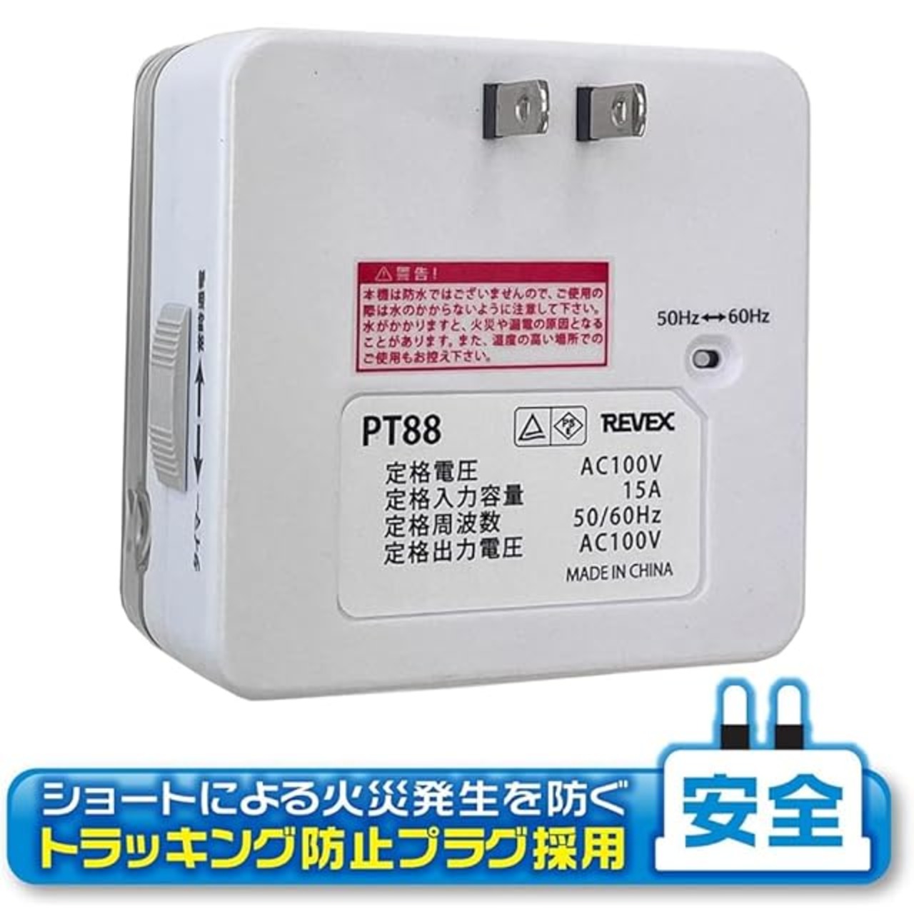 入力電圧:AC100V・50/60Hz (裏側のスイッチで周波数を切り替える)、出力電圧:AC100V・50/60Hz、消費電力:1W以下、定格入出力容量:1500Wまで (抵抗負荷のとき)
