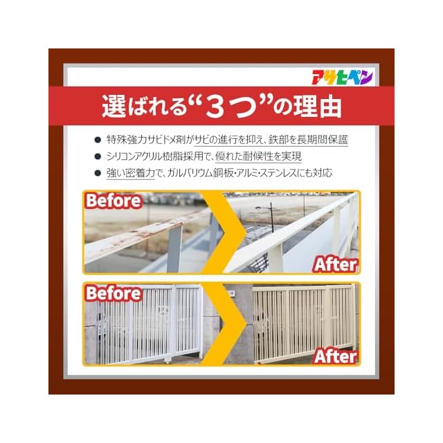 用途:(屋内外区分:屋内外用)扉、フェンス、シャッター、パイプ、機械器具、農機具などの屋内外の鉄部・鉄製品ガルバリウム鋼板のサイディング、トタンべい、アルミ建材、ステンレス製品。
