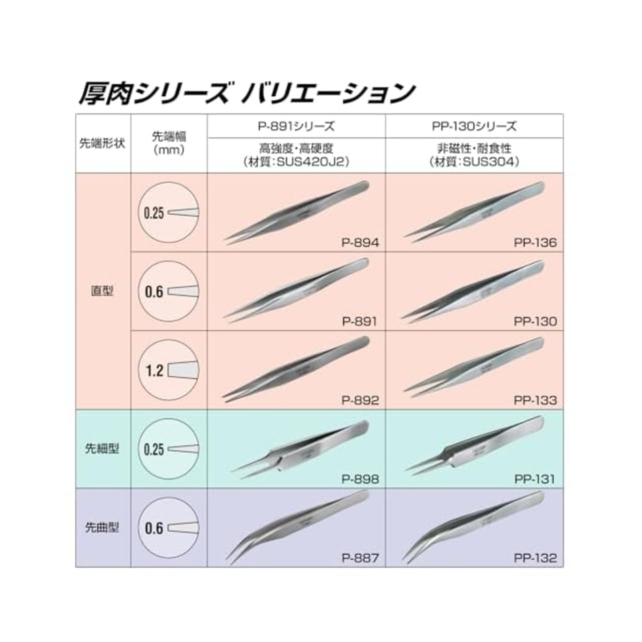 強くつかんでもしなりがなく、つかんだ感触がしっかりと手に伝わる強力型ピンセット。板厚2.3mmのスタンダードシリーズ。