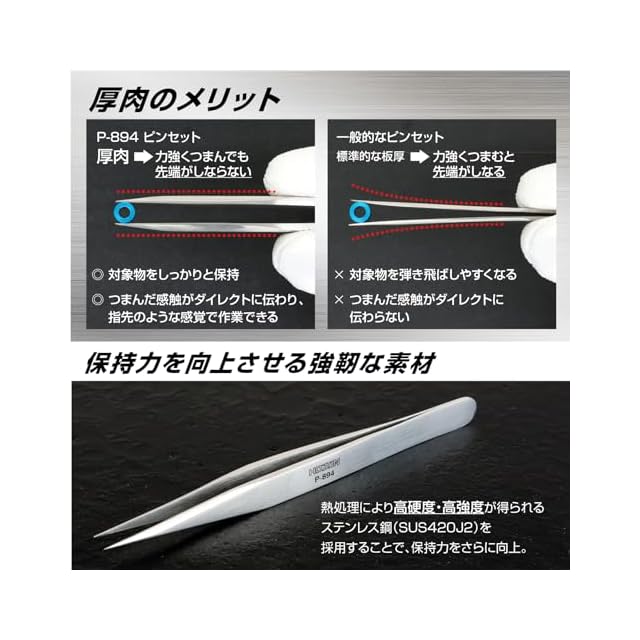 【材質】ステンレス(SUS420J2)【重量】25g【全長】125mm【板厚】2.3mm【先端幅】0.25mm【用途】部品交換・組立作業、ハンダ付け、ネジ掴み、プラモデル・模型・アクセサリーの製作、UVレジン、ネイルアート、まつエク、キャラ弁、パズル、ダイヤモンドアート、ビーズワーク、アイロンビーズ、ナノビーズ、手芸、標本製作、ペーパークラフト、ポーセラーツ、園芸、観葉植物・多肉植物のお手入れ