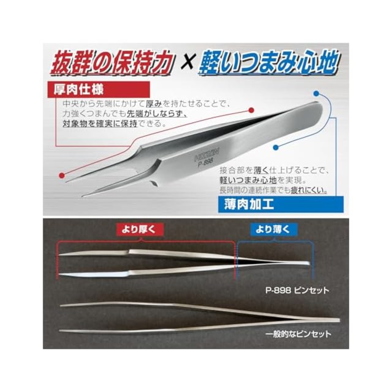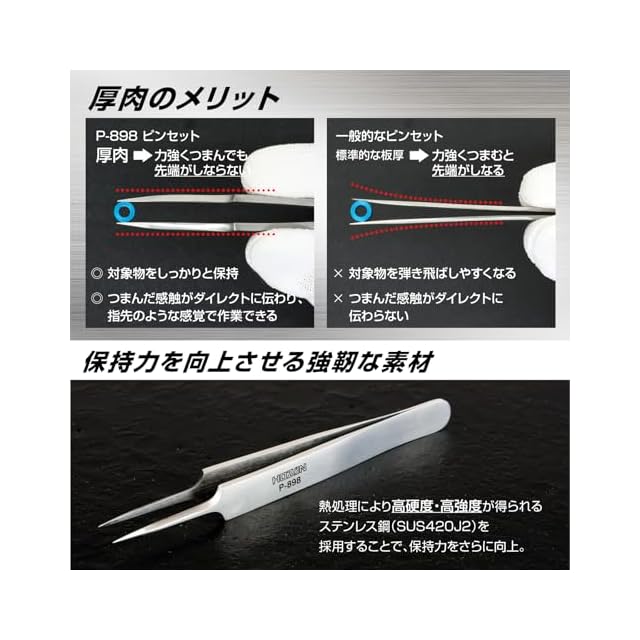 熱処理を施した強靭な素材で、強くつまんでもしなりにくい。対象物を確実につかみます。先端部が細身のため視野を妨げにくい形状です。