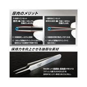 【材質】ステンレス(SUS420J2)【重量】17g【全長】110mm【板厚】2.0mm【先端幅】0.25mm【用途】部品交換・組立作業、ハンダ付け、ネジ掴み、プラモデル・模型・アクセサリーの製作、UVレジン、ネイルアート、まつエク、キャラ弁、パズル、ダイヤモンドアート、ビーズワーク、アイロンビーズ、ナノビーズ、手芸、標本製作、ペーパークラフト、ポーセラーツ、園芸、観葉植物・多肉植物のお手入れ