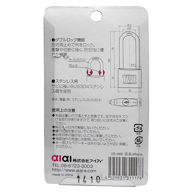 商品名:AIAI TWE ステンレス吊長 南京錠 40MM 防犯 物置 門扉 IBー088