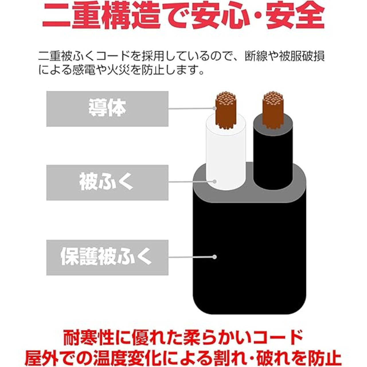【5mの延長コード】耐寒性に優れた、屋外で使える、柔らかい日本製の延長コードです。