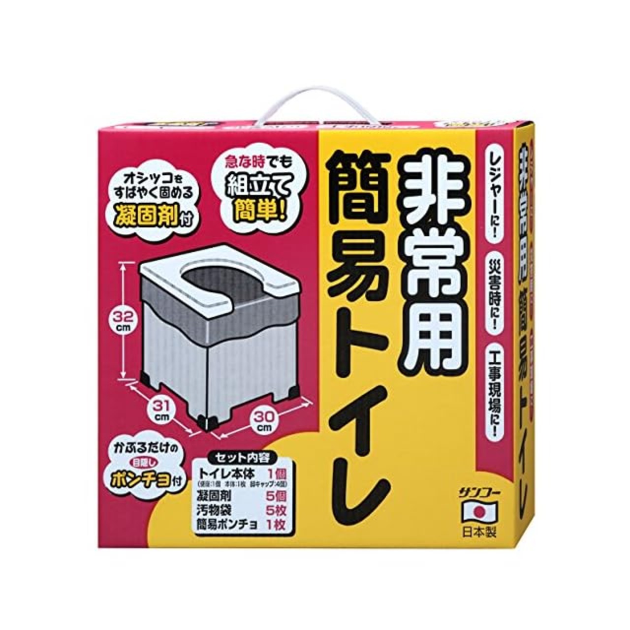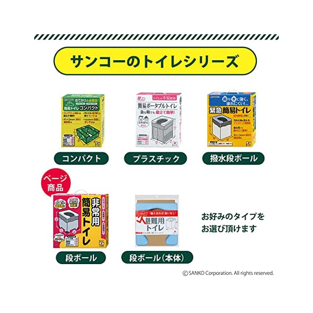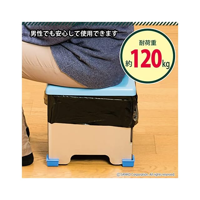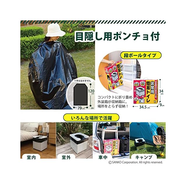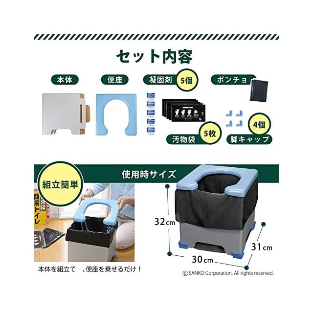 【素材】便座/ポリプロピレン、本体/紙、脚キャップ/ポリエチレン、凝固剤/高分子ポリマー、汚物袋/ポリエチレン、簡易ポンチョ/ポリエチレン