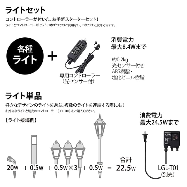 当社ローボルトガーデンライトシリーズの商品に限り、付属の専用コントローラ(LGL-T02)で 8.4Wまで接続が可能です。当社別売の専用コントローラー(LGL-T01)で 24.5W まで接続が可能です。※必要に応じて延長コード (LGL-03)、4分岐コード(LGL-20)、ジャンクションプラグ(LGL-02)をお買い求めください。