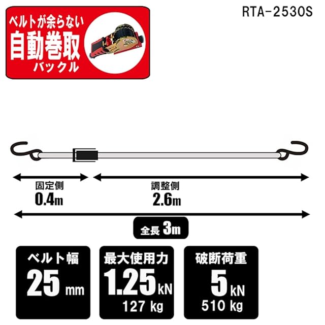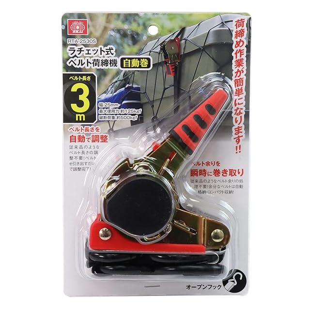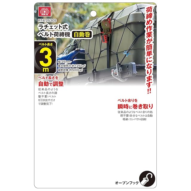 商品名:SK11(エスケー11) ラチェット式ベルト荷締機 自動巻 ベルト幅25mm×3m オープンフック RTA-2530S