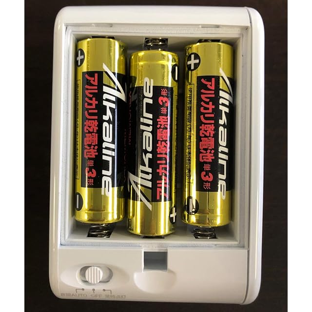 電源:単3アルカリ乾電池×3本 (別売)、電池寿命:夜間AUTO/約12か月(1日10回、1回15秒間点灯時・気温20度)・常時点灯/連続使用で約40時間