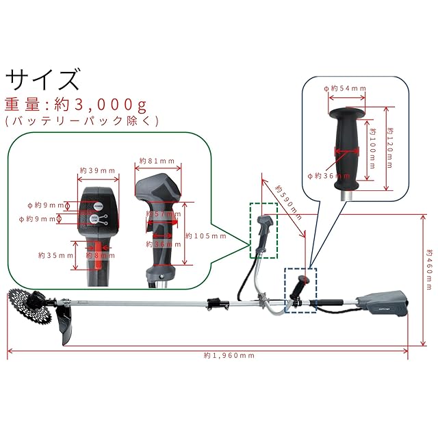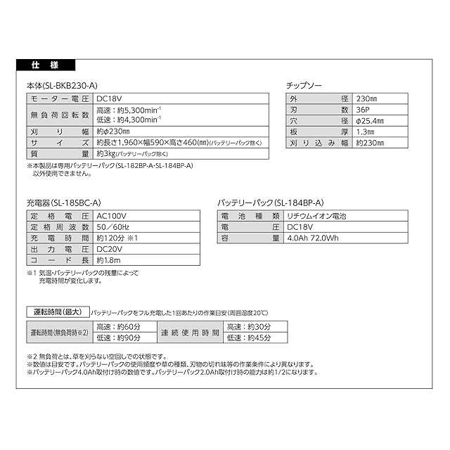 【仕様】本体(SL-BKB230-A)モーター電圧:DC18V、無負荷回転数:高速 約5,300min-1/低速 約4,300min-1 、刈り幅:約φ230mm、サイズ:約長さ1,960×幅590×高さ460(mm) ※バッテリーパック除く、質量:約3kg※バッテリーパック除く、チップソー外径:230mm、刃数:36P、穴径:φ25.4mm、板厚:1.3mm、刈り込み幅:約230mm