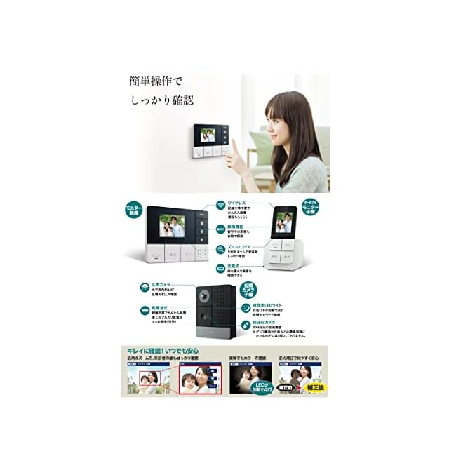 ■取付条件:露出型:JIS1個用スイッチボックス(カバー付)適合 ■無線通信方式:1.9GHz DECT準拠方式 ■撮影画角:(水平)約130°(垂直)約90°